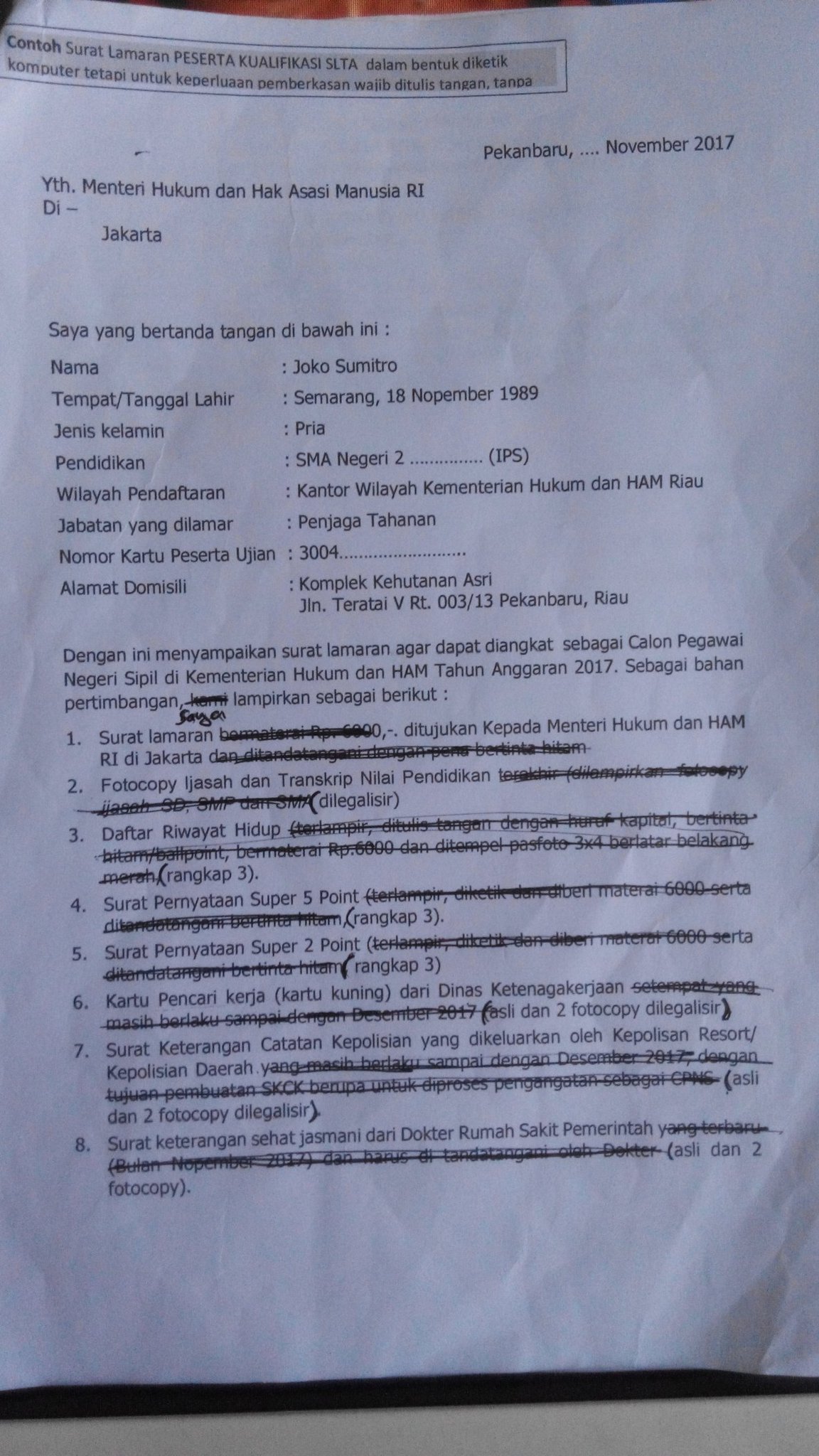 Contoh surat lamaran cpns ini kami tulis sebagai bahan rujukan bagi kamu yang sedang mempersiapkan diri untuk mengikuti seleksi masuk daftar online cpns pendaftaran cpns kementerian hukum dan ham terbaru format terbaru contoh surat lamaran slta d3 d3 papua s1 s1 papua di cpns. Kedua surat ini dapat diketik menggunakan komputer atau ditulis tangan bermaterai rp 10 ribu ditandatangani dengan pena bertinta warna hitam. Dalam menulis surat lamaran khususnya cpns biasanya menggunakan tulisan tangan ada beberapa yang menggunakan sistem on line berikut ini adalah contoh isi surat lamaran kerja. Daftar online cpns pendaftaran cpns kementerian hukum dan ham terbaru format terbaru contoh surat lamaran slta d3 d3 papua s1 s1 papua di cpns kementerian hukum dan ham tahun 2017 pendaftaran calon pns tahun 2017 sudah dibuka pada hari selasa lalu yaitu instansi kementerian hukum dan ham yang mana membuka penerimaan sebanyak 17962 formasi. Format surat lamaran untuk jenjang pendidikan slta sederajat. Untuk kementerian hukum dan hak asasi manusia (kemenkumham) menjadi syarat wajib mencantumkan surat lamaran. Maybe you would like to learn more about one of these? Kemenkumham mensyaratkan kamu untuk melengkapi dokumen persyaratan berupa surat lamaran yang ditujukan kepada. Contoh lengkap surat lamaran cpns surat pernyataan format 1131 x 1600 pixel. Berikut contoh surat lamaran dan surat pernyataan untuk mendaftar seleksi cpns kementerian agama kemenag 2019. Contoh surat lamaran hukum dan ham untuk slta tulis tangan. Check spelling or type a new query. Contoh surat lamaran hukum dan ham untuk slta tulis tangan.